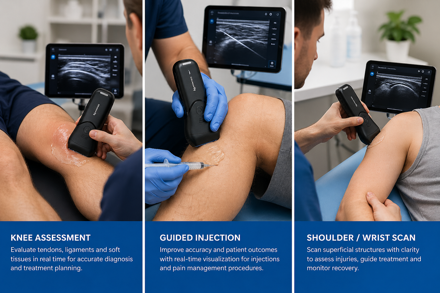 Designed for MSK, vascular, guided injections, physiotherapy, pain management, thyroid, breast, and general superficial imaging, helping practitioners use one scanner across multiple applications.