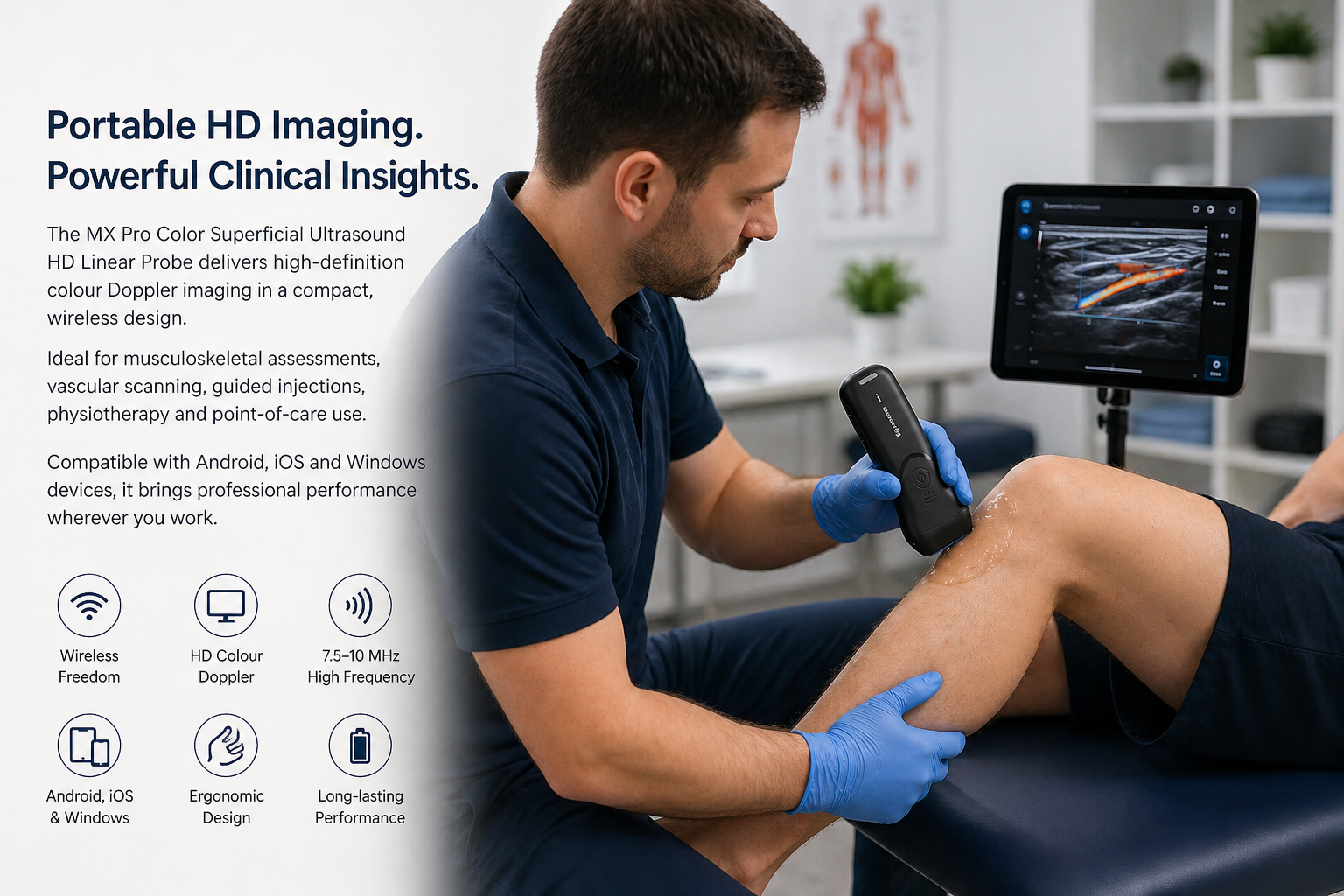 The MX Pro Color Superficial Ultrasound HD Linear Probe is a premium wireless HD colour Doppler ultrasound scanner designed for clinicians who need performance, portability, and versatility without compromise. With 7.5–10 MHz high-definition imaging, it delivers clear real-time visualisation of muscles, tendons, blood vessels, nerves, and soft tissues - making it ideal for musculoskeletal assessments, vascular scanning, guided injections, physiotherapy, and point-of-care diagnostics.