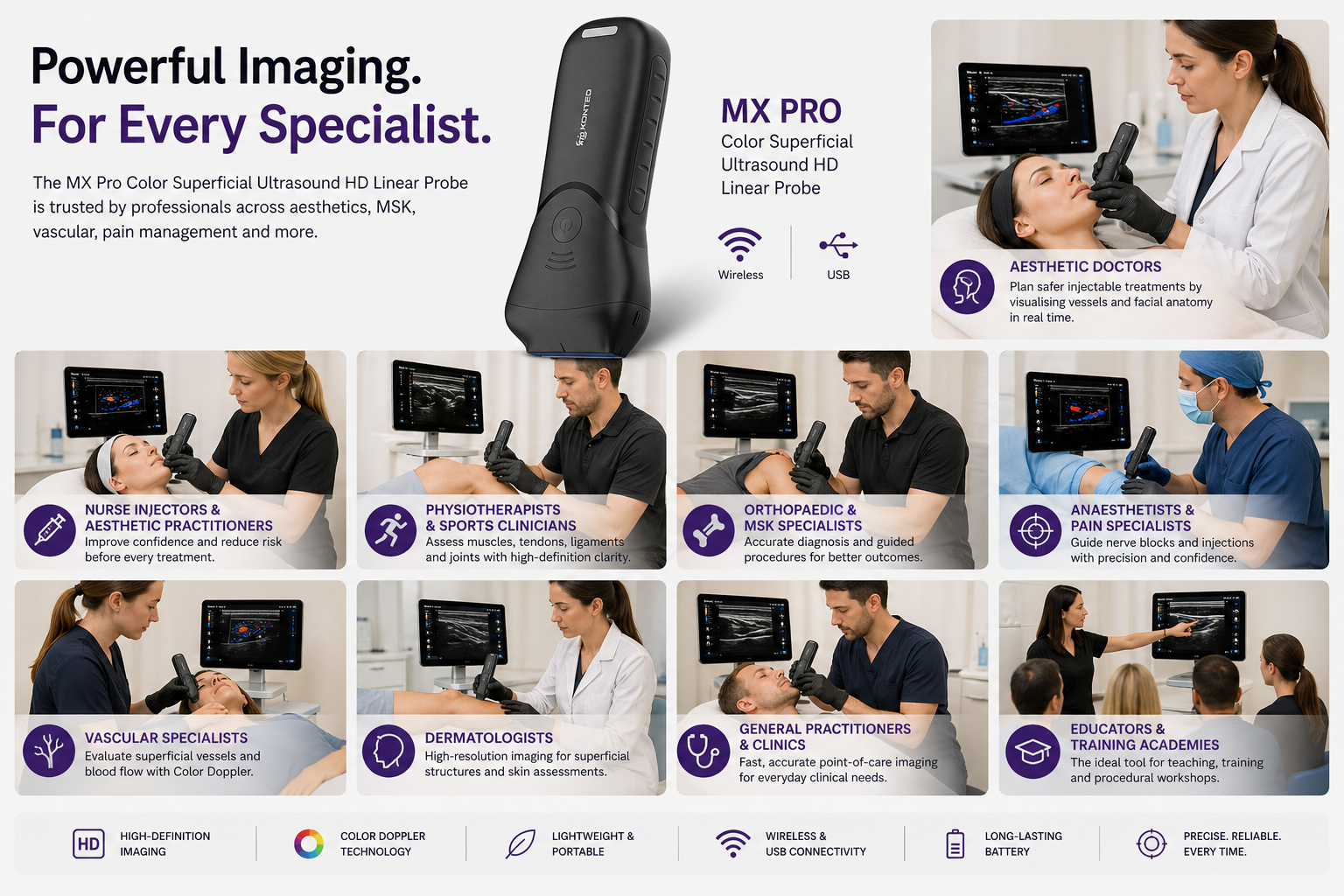 The MX Pro is designed for clinicians who need portable, high-definition superficial imaging with Colour Doppler capability. It is especially well suited for practitioners working in aesthetics, musculoskeletal care, vascular imaging, pain procedures, and point-of-care diagnostics. Oras Medical positions it for facial aesthetics as well as broader clinical use including physiotherapy and anaesthesiology.