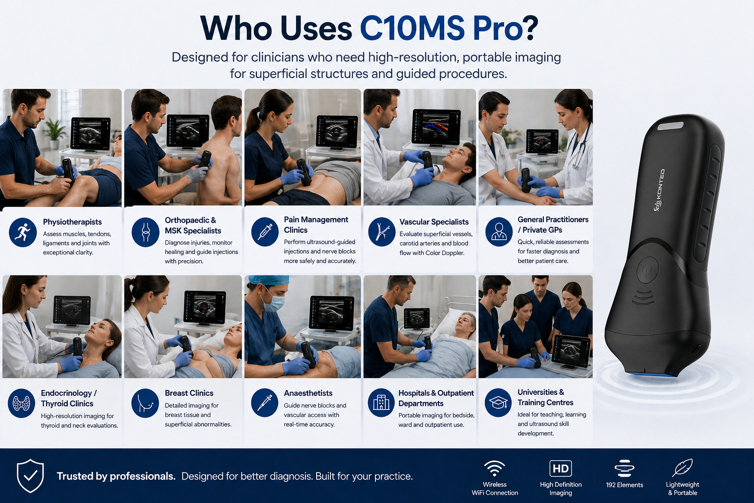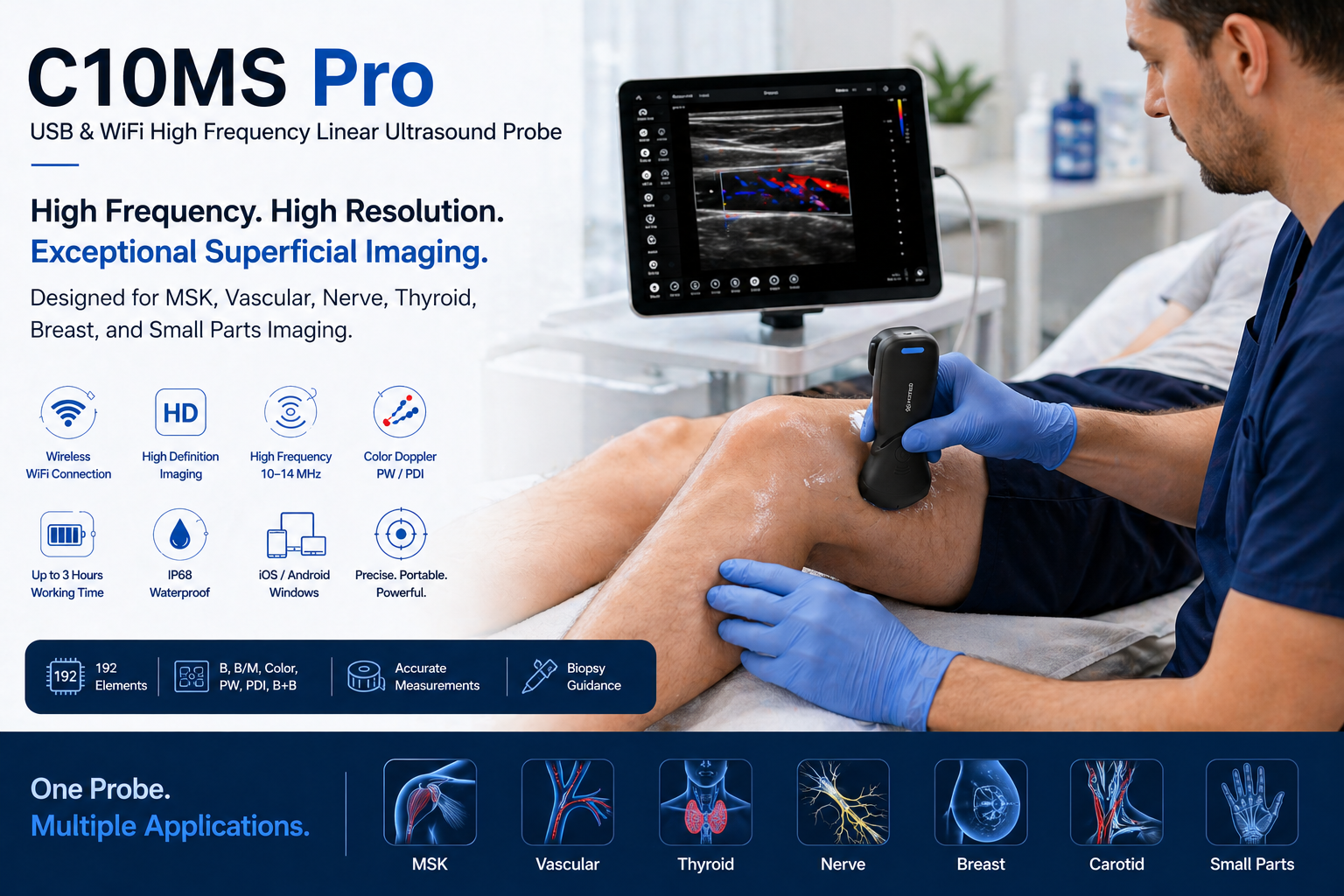 The C10MS Pro USB & Wifi High Frequency Linear Ultrasound Probe is built for clinicians who need fast, accurate imaging without the cost or inconvenience of bulky ultrasound systems.