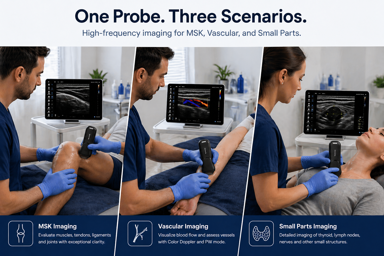 Provides portable ultrasound capability for quick superficial assessments, triage, and same-day diagnostic support.