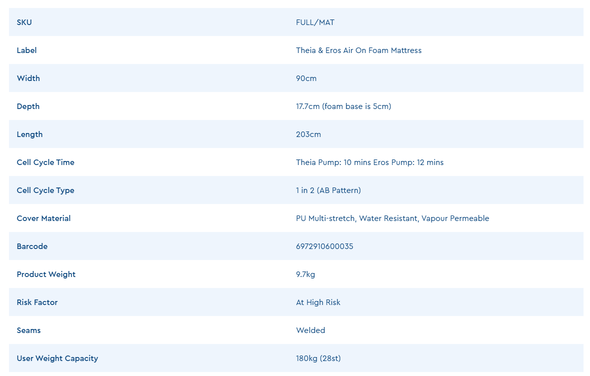 The Air on Air Replacement Mattress is designed to provide immersive pressure relief for individuals at high risk of skin breakdown, forming an essential part of a comprehensive care plan. It is compatible with both the Theia Digital Pump and the Eros Dial Pump for tailored pressure management. Please note: This SKU (AIR/MAT) refers to the mattress only. The Theia Digital Pump (THEIA/PUMP/2) and Eros Dial Pump (EROS/PUMP) are sold separately.