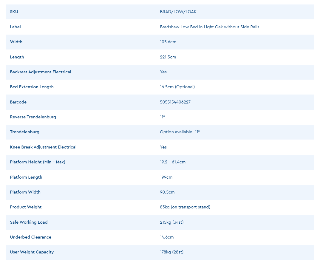 The Bradshaw bed range combines clinical functionality with comfort and attractive design, making it ideal for home care, nursing, and residential care environments. This four-section, electrically operated profiling bed offers adjustable height, head, foot, and knee sections, supporting effective resident care and helping to reduce the risks associated with immobility.